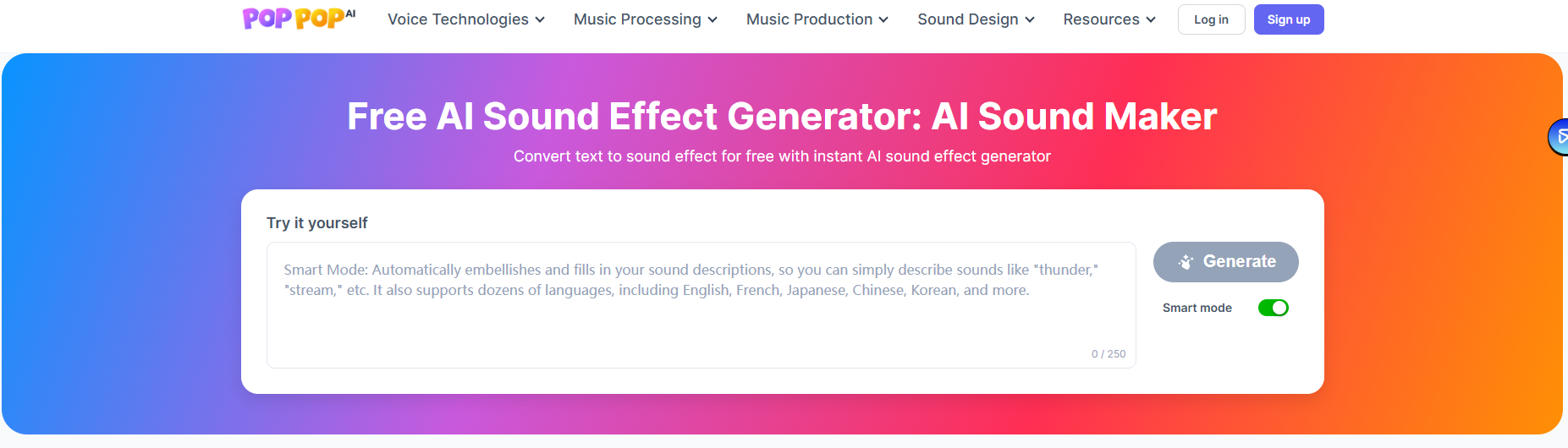 PopPop AI is popular with creators who use text prompts. You can make sound effects up to 60 seconds long. PopPop AI has natural, human, musical, ambient, and special effects. Smart Mode helps you get better results. You can download sounds without signing up. This makes it a good sound effect tool for fast projects.