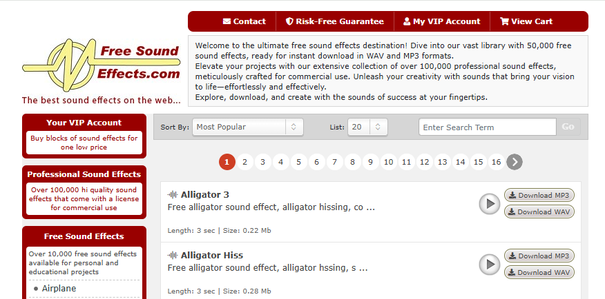 SoundBible is a special place for free, royalty-free sound effects. You get a library with thousands of sounds to download. Many sounds have detailed captions to help you find what you need.