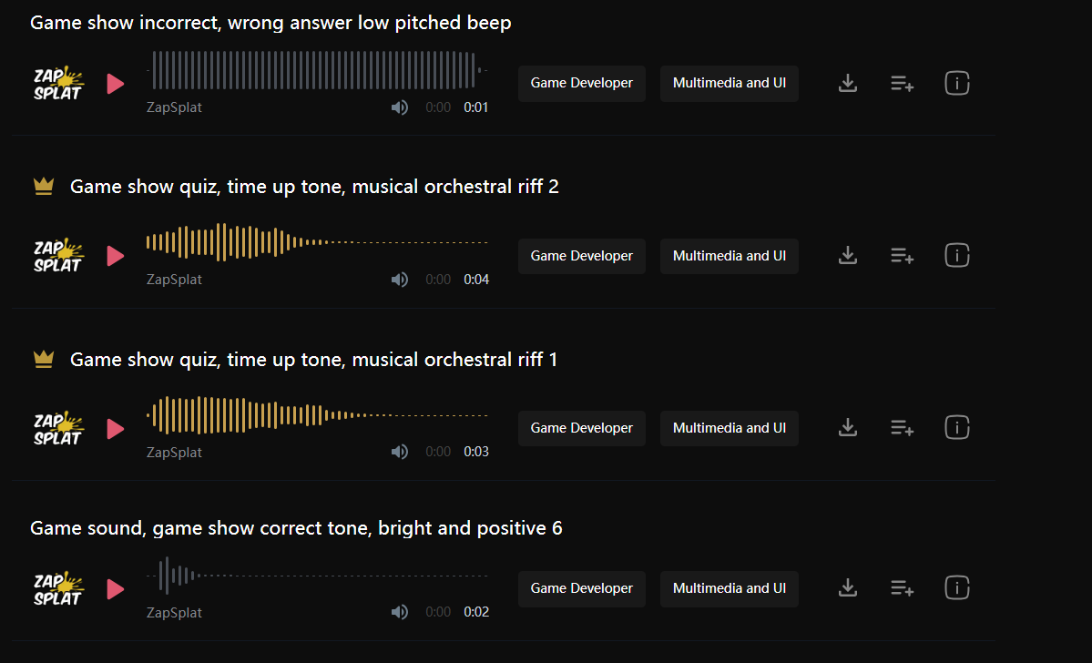 Uppbeat offers a platform full of free sound effects and music for your game show. You can search for buzzer, wrong buzzer sound effect, or winner sounds. The site has clear categories and an extensive collection of free sound clips. You can download clips for free and use them in your projects. Uppbeat’s sound library covers everything from classic game show sounds to modern effects. You can access the platform online and find new clips every week.