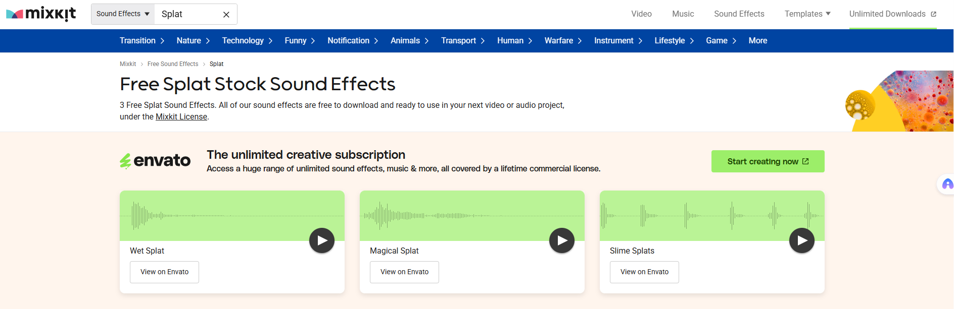 Mixkit brings you a fresh take on free sound effects. You get a modern website with a clean design. You can search for splat sounds or browse by category. Each sound comes with a short preview. You can listen before you download. This saves you time and helps you pick the right effect.