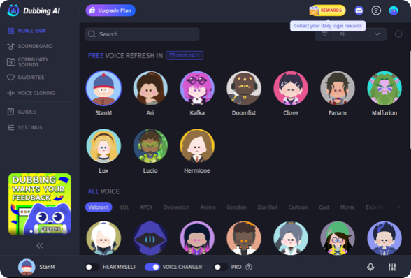 Download for FreeDubbing AI Voice Changer lets you dive into immersive conversations, social interactions, and role-playing with your friends and teammates across platforms like Discord, Zoom, VRChat, and WhatsApp. With access to over 500 iconic characters, it brings voices from popular games like League of Legends, Valorant, CS2, Fortnite, and Roblox, as well as trending anime such as Jujutsu Kaisen and JoJo's Bizarre Adventure, into your interactions.